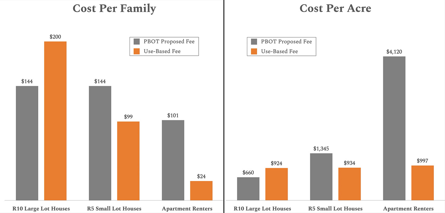 The proposed Transportation Utility Fee (TUF) of $12/month for single-family lots, and $8.50/month for apartment dwellers means apartment dwellers will pay 600% more on a per-acre basis than homeowners on R10-zoned lots (93% of the parcels in Northwest Heights and 81% of the parcels in Arnold Creek), and 300% compared to those on R5-zoned lots (99% of the parcels in Sabin and 97% of the parcels in Alameda), which becomes apparent when examining the fee on a per-acre basis.